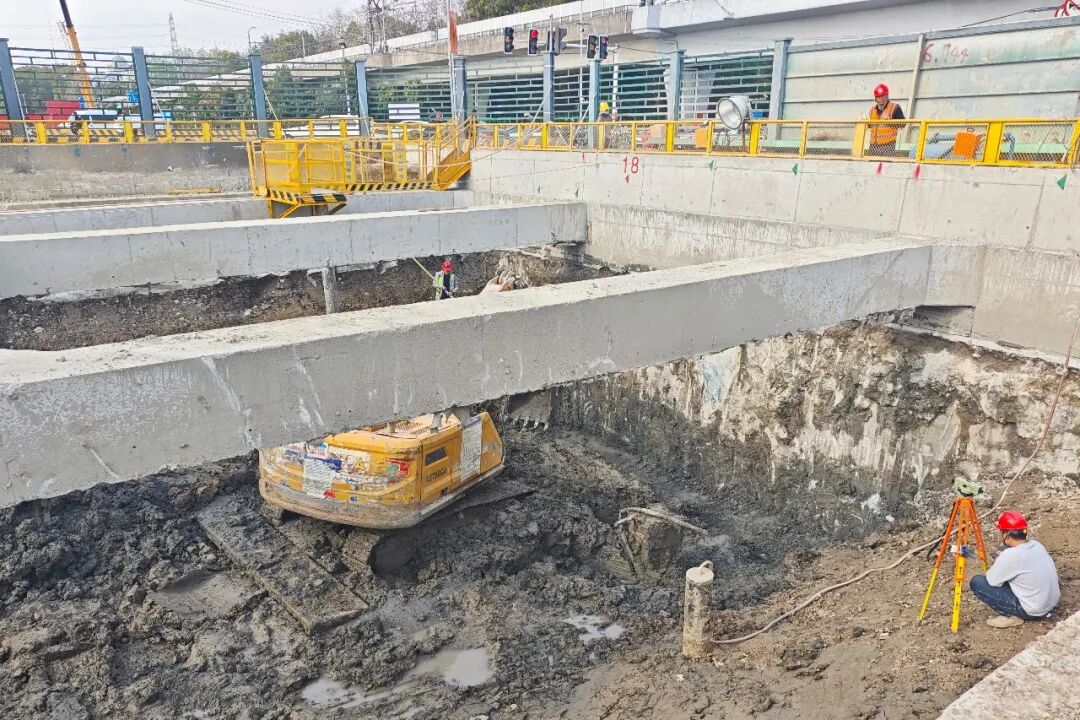 >>3月28日,嘉闵线20标项目银都路站2-2区逆作顶板正式开挖施工。该逆作顶板采用钢筋混凝土结构,通过“永临结合”方式一次性永久迁改电力、燃气管线,为车站主体结构后续安全高效施工奠定了坚实基础。(佘术军)