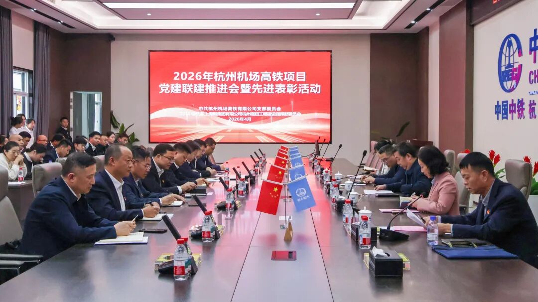 4月16日,杭州机场高铁站前5标项目经理部党总支联合杭州机场高铁有限公司党支部、中国铁路上海局集团有限公司杭州铁路枢纽工程建设指挥部党支部,共同举办2026年党建联建推进会暨先进表彰活动,涵盖先进单位及个人表彰、经验交流等环节。公司杭州机场高铁站前5标项目经理部荣获“清廉工程示范单位”称号,王二彪荣获“党建联建标兵”称号,任悦荣获“清廉标兵”称号,梁正双荣获“宣传先进标兵”称号,符刚荣获“项目攻坚标兵”称号。(杜雷鹏 梁正双 申琦)