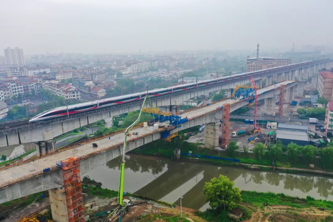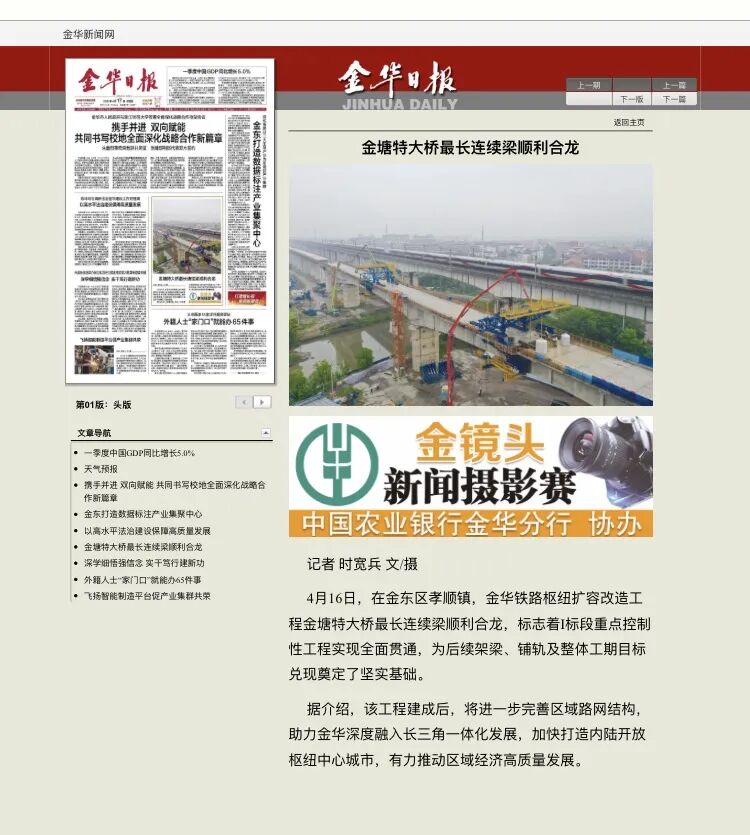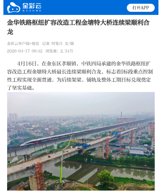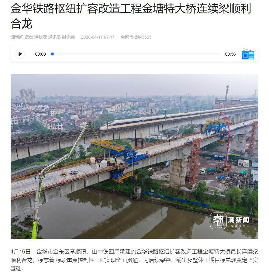 4月17日,浙江日报潮新闻:金华铁路枢纽扩容改造工程金塘特大桥连续梁顺利合龙。(金华铁路枢纽扩容1标项目经理部)