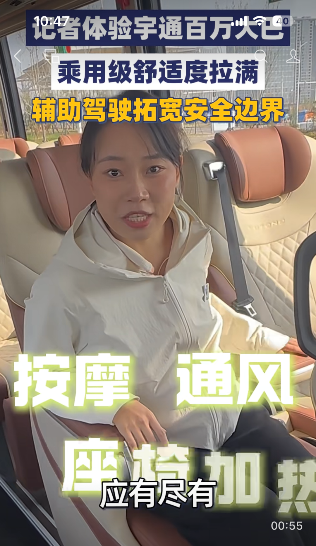 河南电视台多位记者在宇通科技节感受了“响应式公交车”带来的一键下单、随叫随到的网约便捷,还体验了宇通“百万大巴”天域S12,称赞其“乘用及舒适度拉满,辅助驾驶拓展了安全边界”!