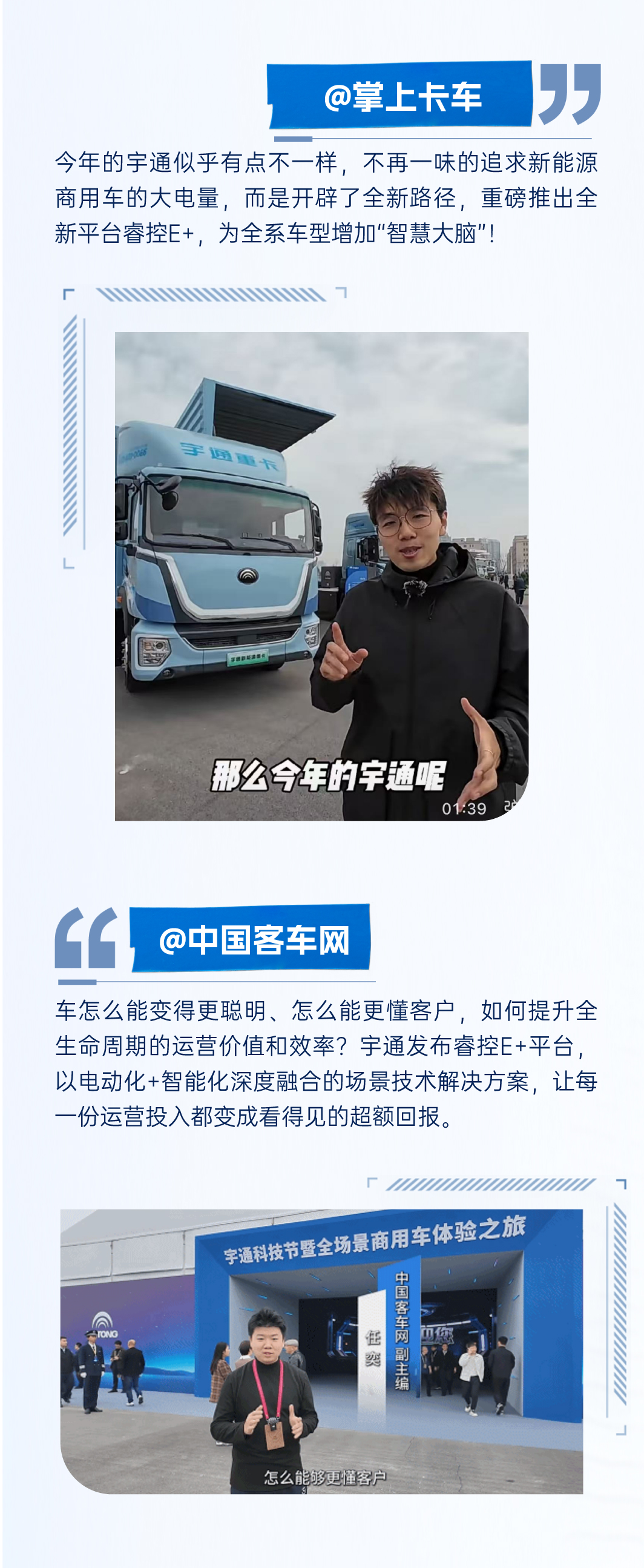 同时,行业垂直媒体与资深KOL深入各体验场景,记录睿控E+平台在出行、物流、作业等场景的实测表现,围绕“全场景商用车价值体验之旅”,通过实景试驾、全链路体验,直观展现宇通智电产品的场景适配能力与科技实力。