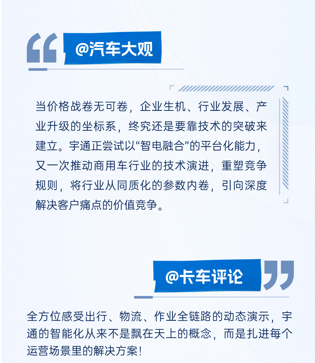 作为车圈的一大盛事,宇通科技节还吸引了国内汽车专业媒体聚焦,他们聚焦睿控E+平台核心技术,直击产品实测表现,解读智电融合的实际价值。点赞宇通跳出参数内卷,以技术创新真正解决客户省钱、赚钱、省心的核心诉求,为商用车行业破局提供了可行路径。