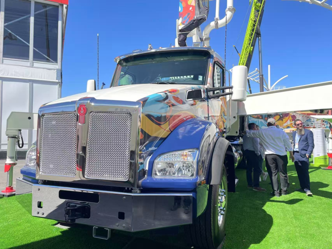 采用“美漫”涂装、搭载北美专用底盘的混凝土泵车同样吸睛无数。泵车最大垂直臂展达151英尺,最大理论排量180立方米/小时,臂架最后两节采用碳纤维技术,实现25%减重并增加有效载荷,持续展现出中联重科在高端混凝土设备领域的技术引领。