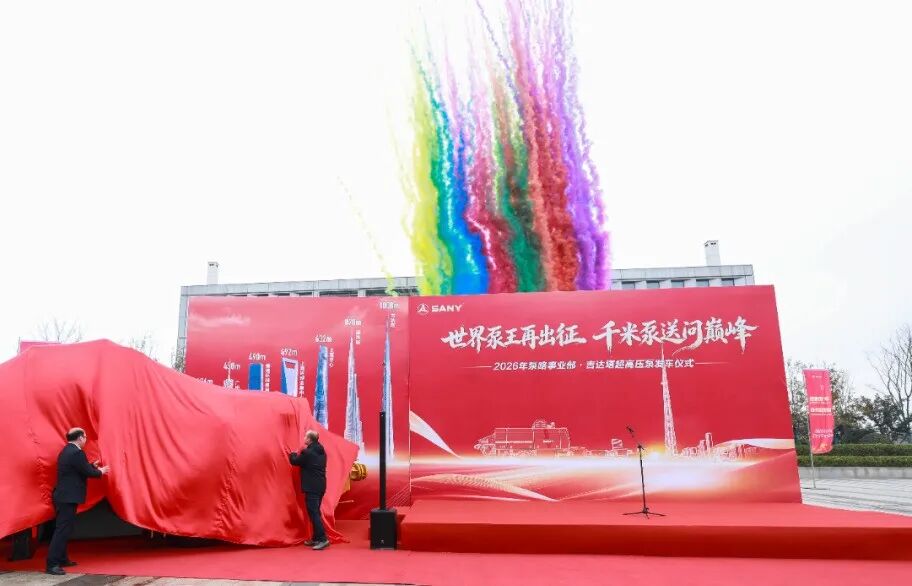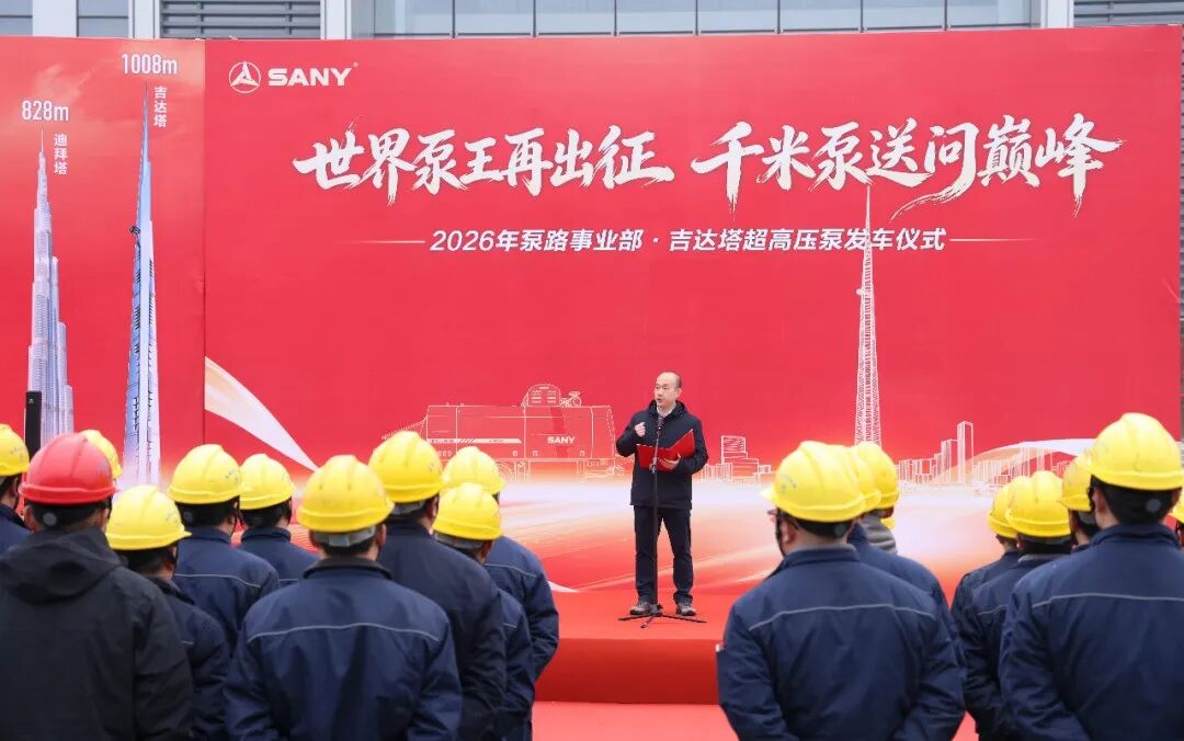 2026年3月3日,泵送新城彩旗飘扬、气势如虹,事业部吉达塔超高压泵发车仪式隆重举行!三一集团总裁助理、泵送公司总经理陈添明先生,泵送研究院副院长何志伟等领导出席仪式,共同为这台承载着梦想与使命的“钢铁雄师”壮行,见证世界泵王向着1008米的全球在建第一高楼——吉达塔,发起千米泵送的巅峰挑战!