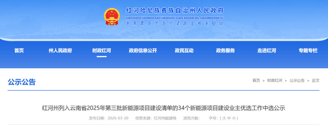 今日风电3月20日,云南省红河哈尼族彝族自治州人民政府发布《红河州列入云南省2025年第三批新能源项目建设清单的34个新能源项目建设业主优选工作中选公示》。