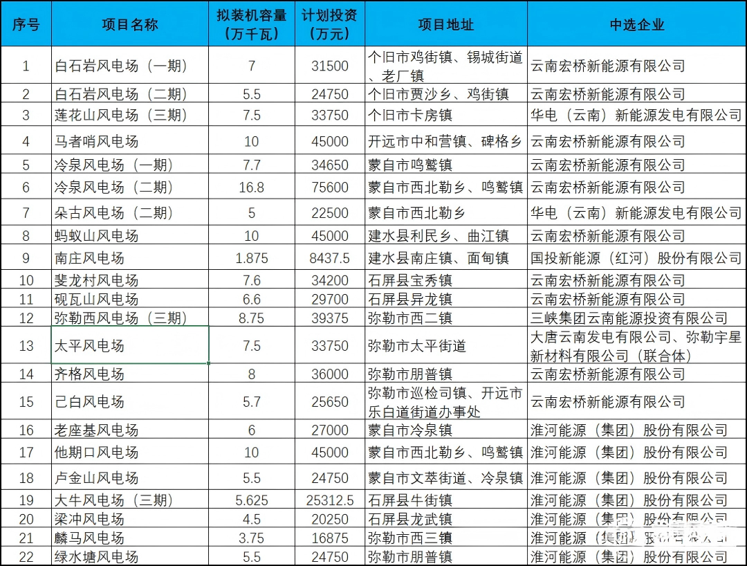 受红河州能源局委托,红河州建设工程招标有限公司于2026年3月19日9时、2026年3月20日9时在红河州建设工程招标有限公司(红河州蒙自市护国路1号红建佳苑商网8号2楼会议室)组织完成了红河州列入云南省2025年第三批新能源项目建设清单的34个新能源项目建设业主优选工作的评测工作。经评测专家组评测,委托方确认,现将中选结果公示如下: 风电项目22个,规模共1564MW。