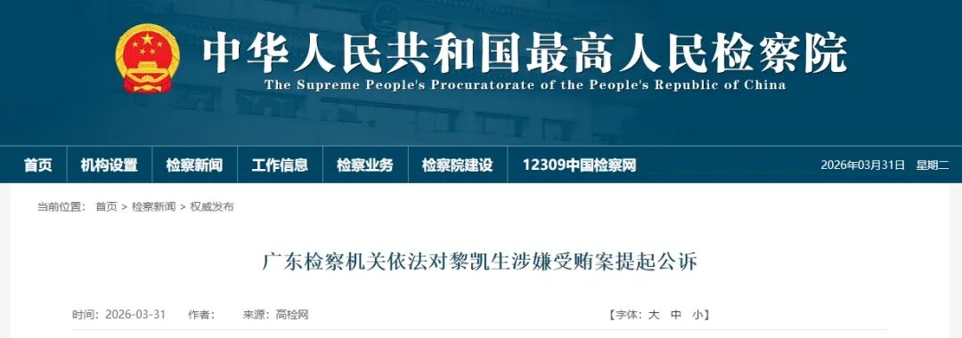 广东检察机关依法对黎凯生涉嫌受贿案提起公诉