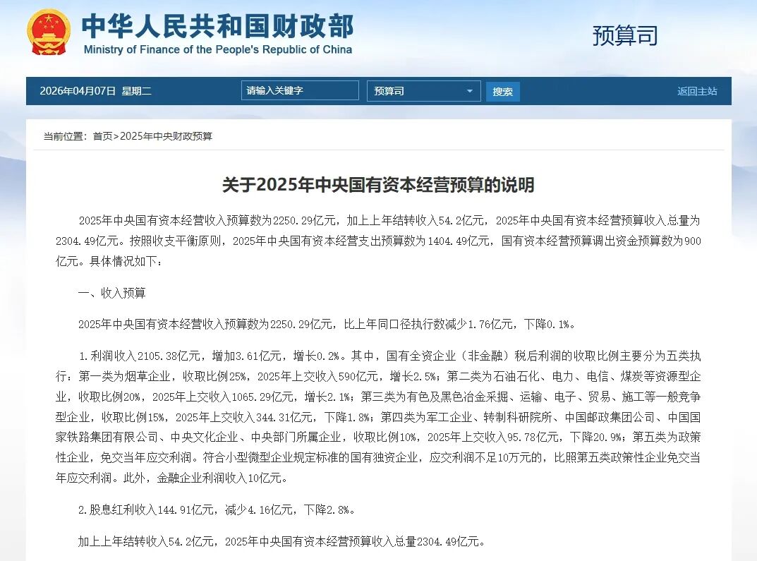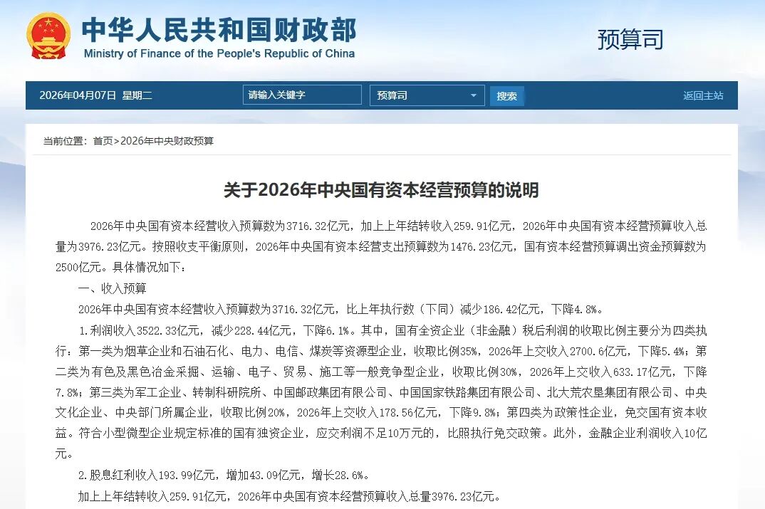 日前,财政部披露了2026年中央财政预算。其中,关于2026年中央国有资本经营预算的说明中显示,2026年国有全资企业(非金融)税后利润的收取比例主要分为四类执行,第一类为烟草企业和石油石化、电力、电信、煤炭等资源型企业,收取比例35%。