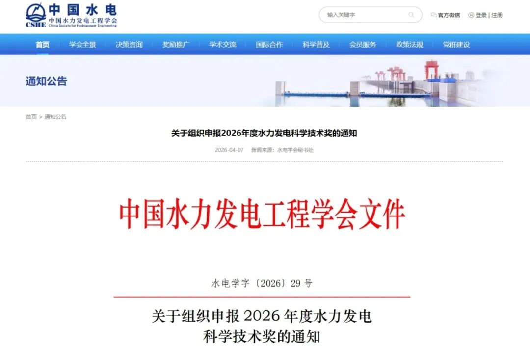 中国水力发电工程学会近日发布通知,正式启动2026年度水力发电科学技术奖的申报工作。该奖项是面向全国水力发电行业的权威科技奖励,旨在表彰和激励在水力发电及新能源领域做出重要贡献的科技成果与科研团队。