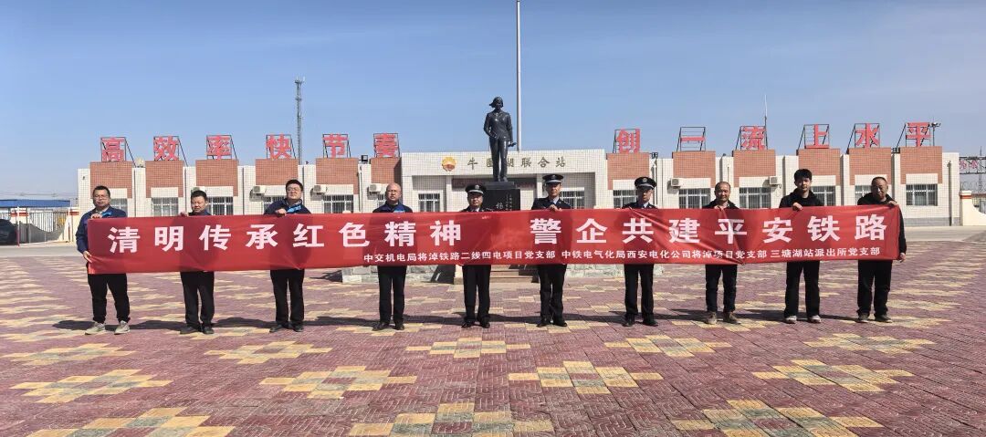 大漠戈壁埋忠骨,清明祭扫铸党魂。为深入学习贯彻党的二十大精神,弘扬爱国主义精神,深化警企联建凝聚发展合力,4月3日,将淖铁路二线1标四电项目党支部联合中铁电气化局西安电化公司将淖项目党支部、乌鲁木齐铁路公安局哈密公安处三塘湖站派出所党支部,共同前往三塘湖采油管理区杨拯陆烈士纪念铜像广场,开展了以“缅怀先烈铸党魂·警企共建促发展”为主题的党建联建活动。
