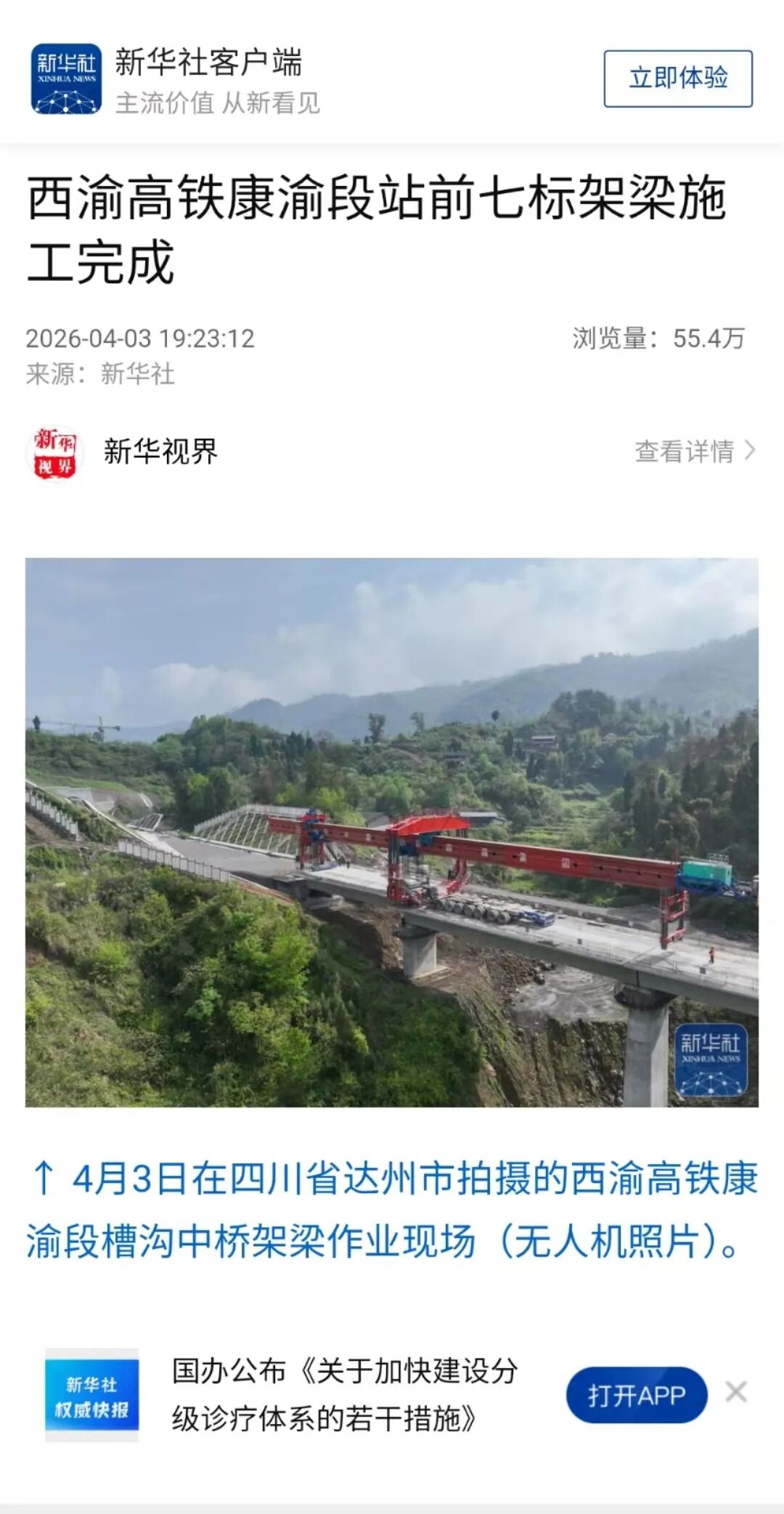4月3日,新华社客户端:西渝高铁康渝段站前七标架梁施工完成。(西渝高铁康渝段站前七标项目经理部)