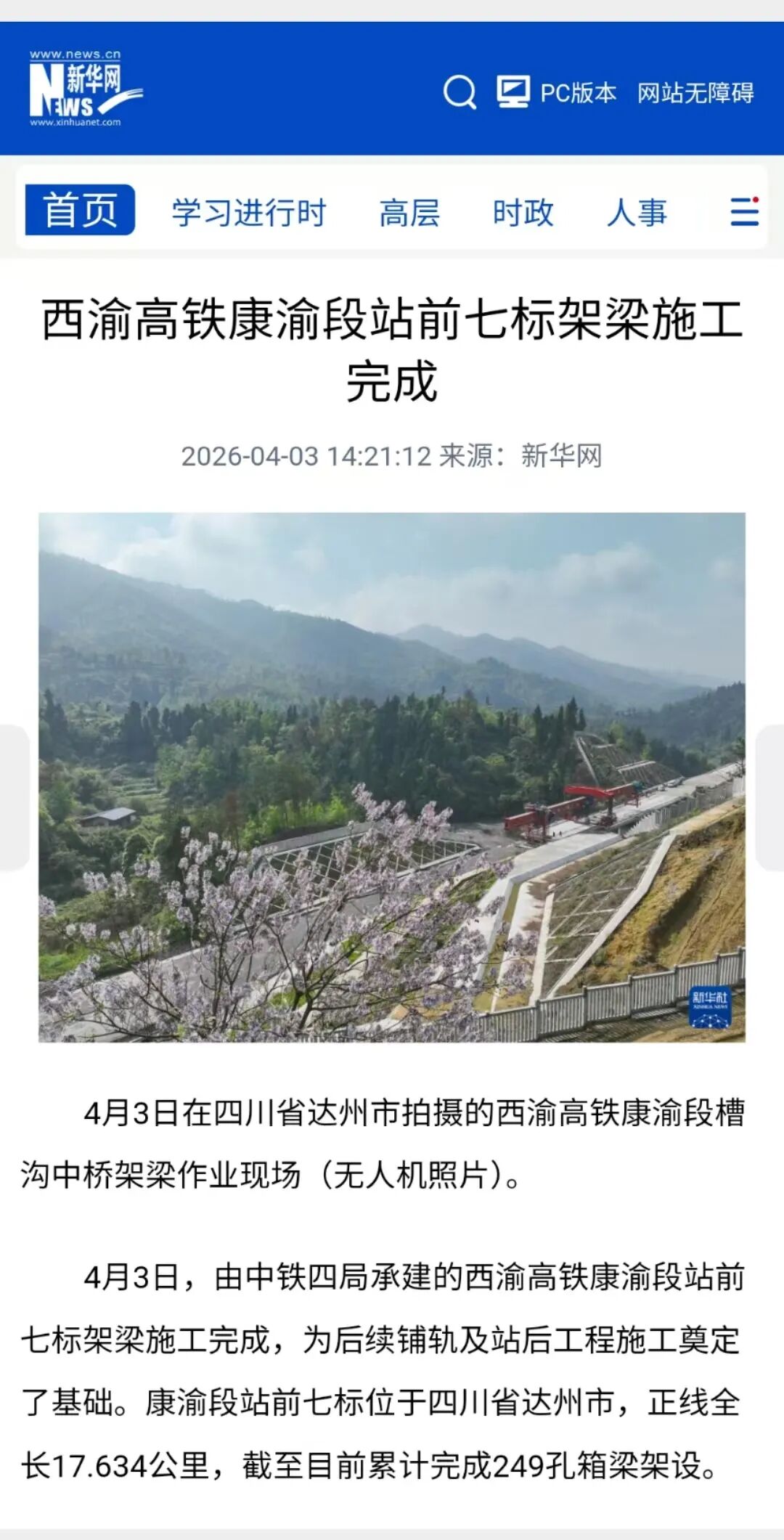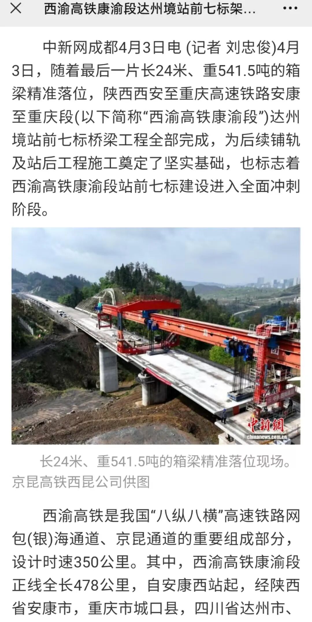 4月3日,中国新闻网:西渝高铁康渝段达州境站前七标架梁施工顺利完成。(西渝高铁康渝段站前七标项目经理部)