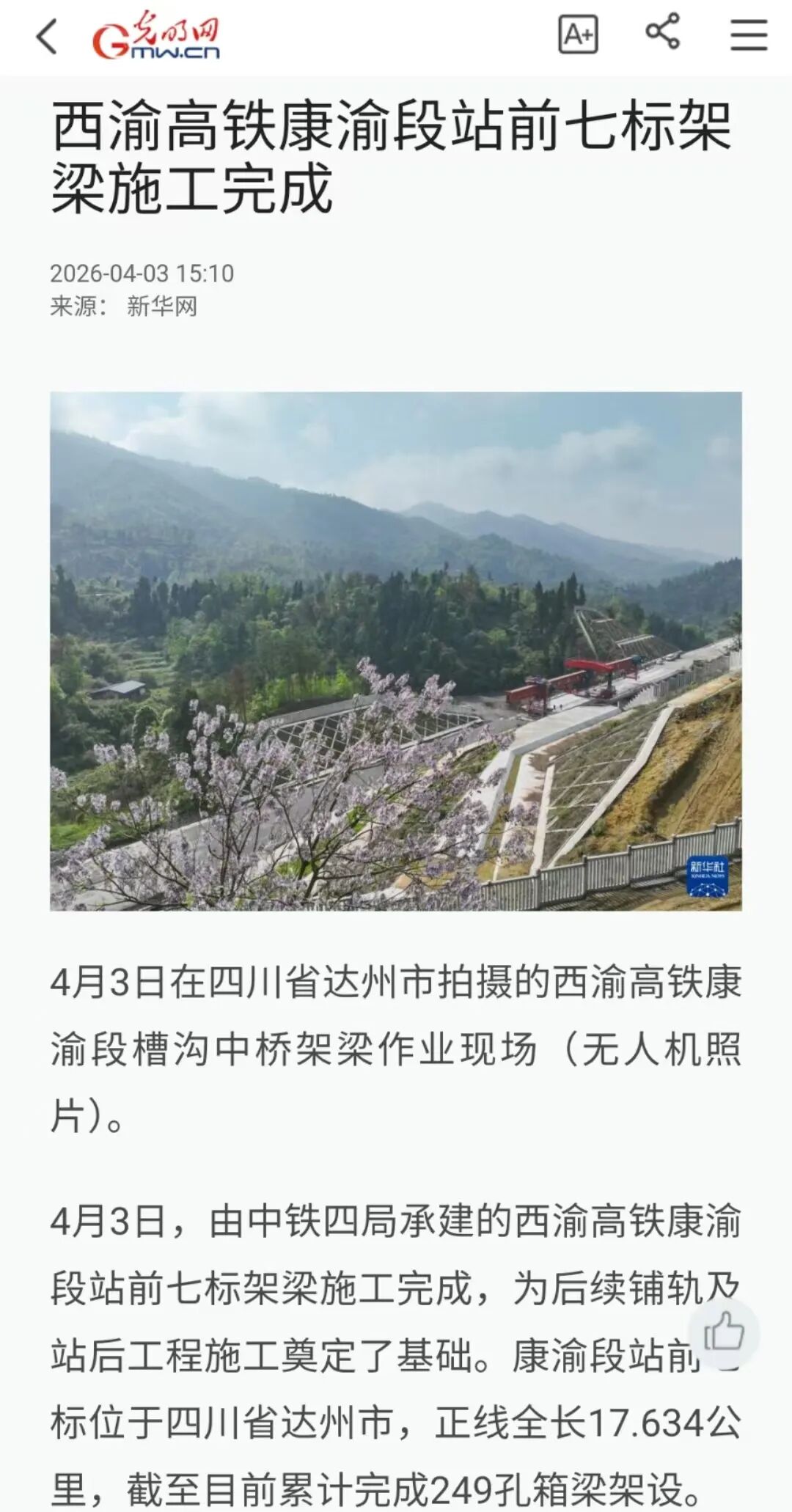 4月3日,光明网:西渝高铁康渝段站前七标架梁施工完成。(西渝高铁康渝段站前七标项目经理部)