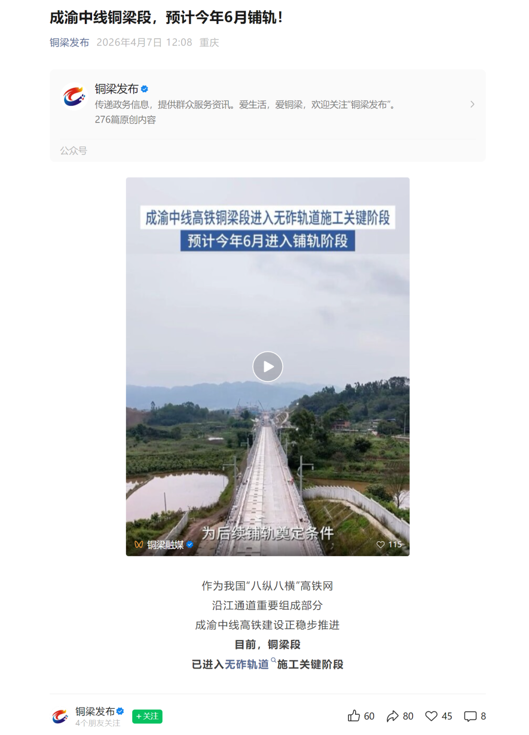 4月7日,铜梁发布:成渝中线铜梁段,预计今年6月铺轨!(成渝中线重庆段站前2标项目经理部)