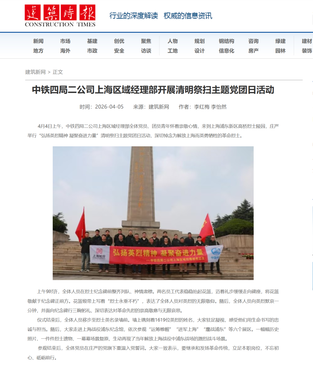 4月5日,建筑时报:中铁四局二公司上海区域经理部开展清明祭扫主题党团日活动。(上海沿江通道项目经理部)