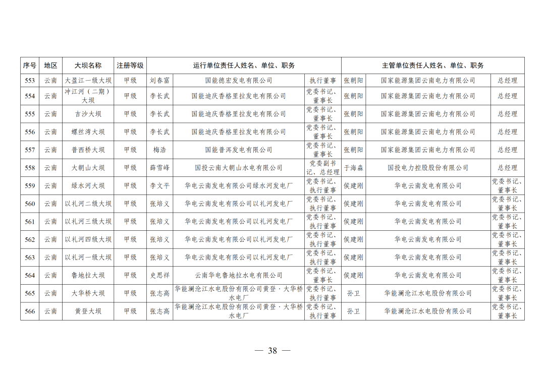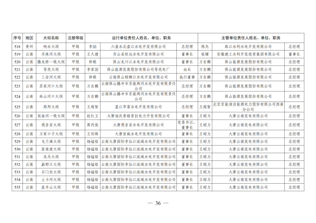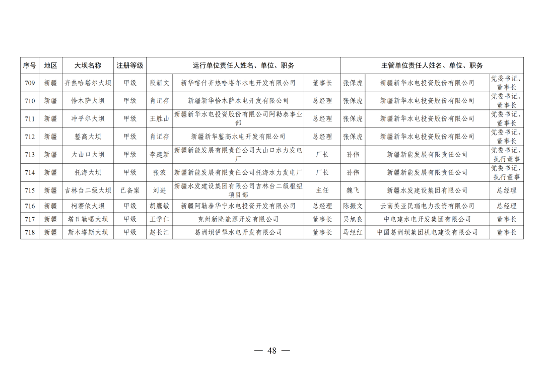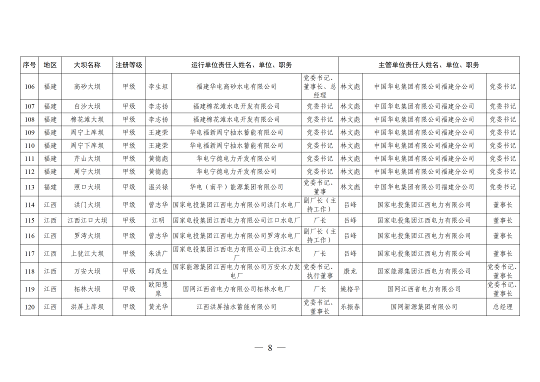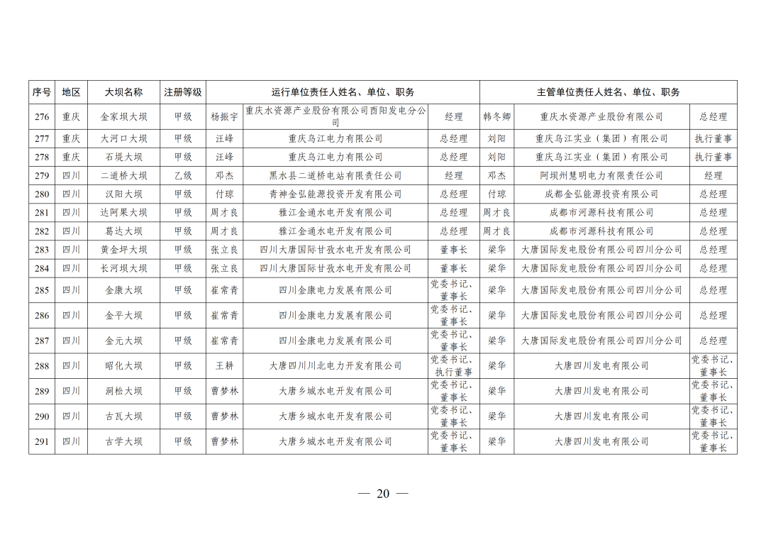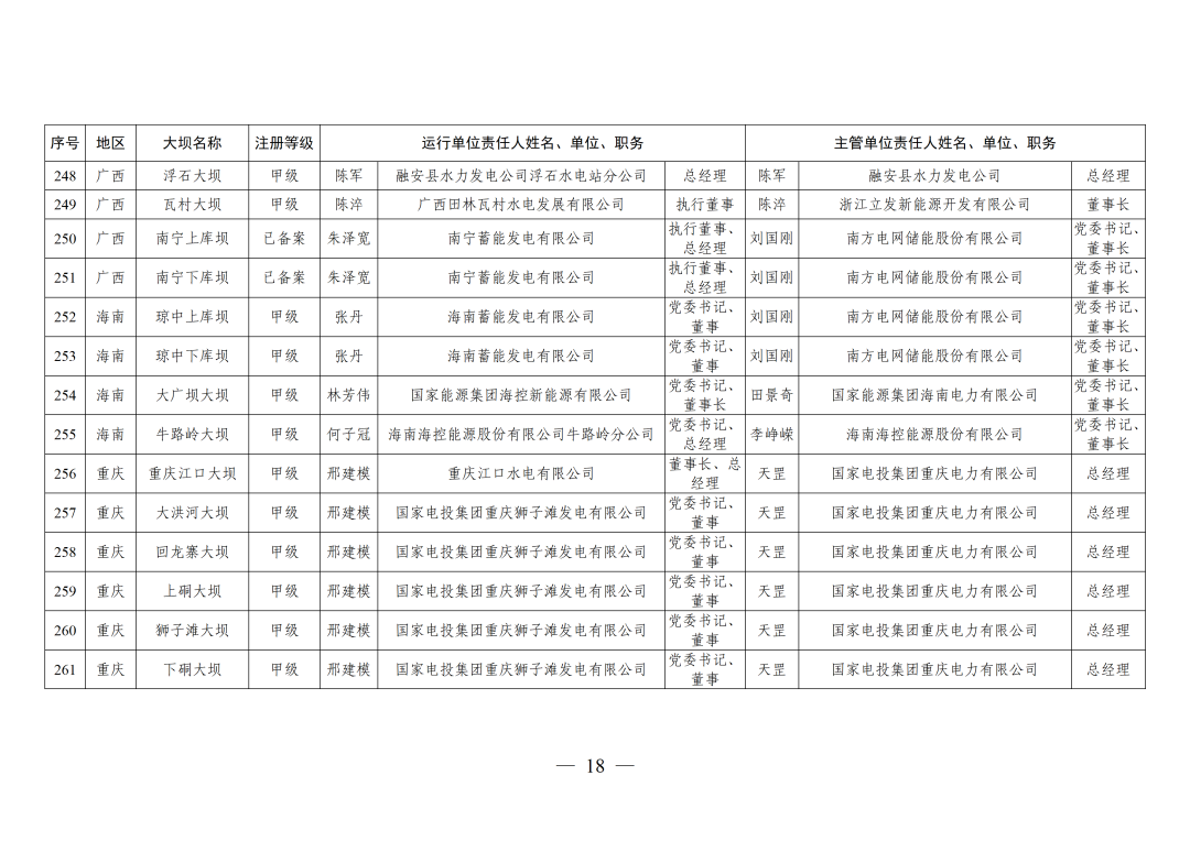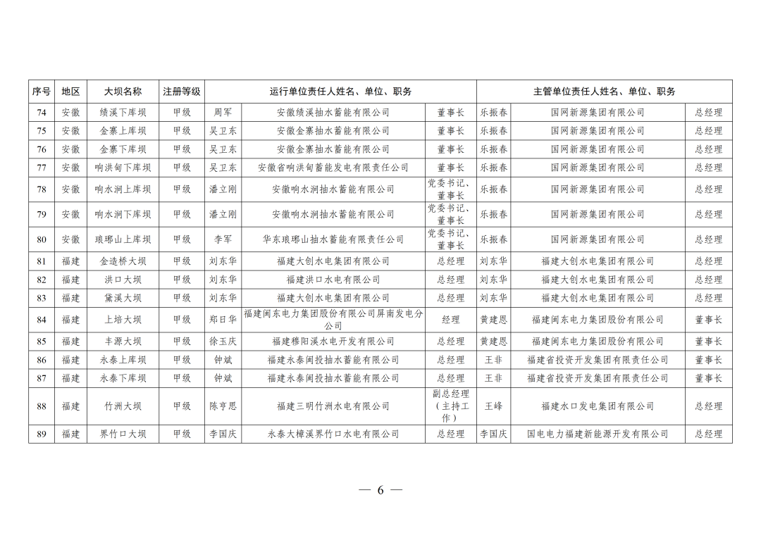 为进一步加强水电站大坝安全监督管理,压紧压实电力企业大坝安全主体责任,按照《水库大坝安全管理条例》(国务院令第77号)、《电力安全生产监督管理办法》(国家发展改革委令2015年第21号)、《水电站大坝运行安全监督管理规定》(国家发展改革委令2015年第23号)等规定要求,现将电力行业718座注册登记和登记备案的水电站大坝(以下简称大坝)运行单位及主管单位的安全责任人名单予以公布。