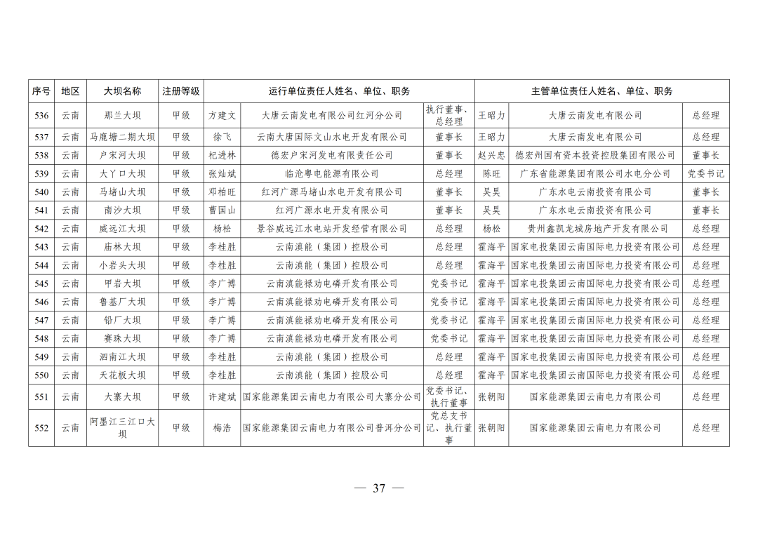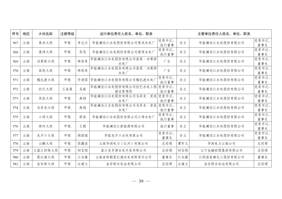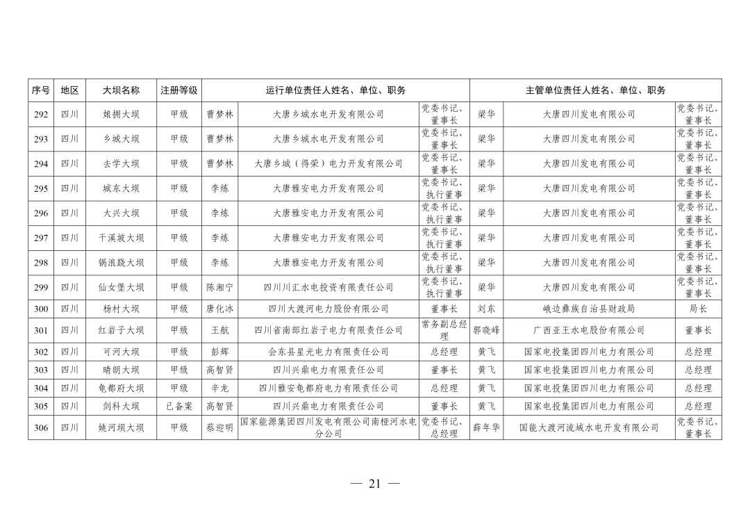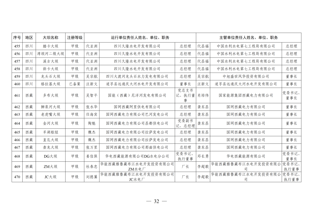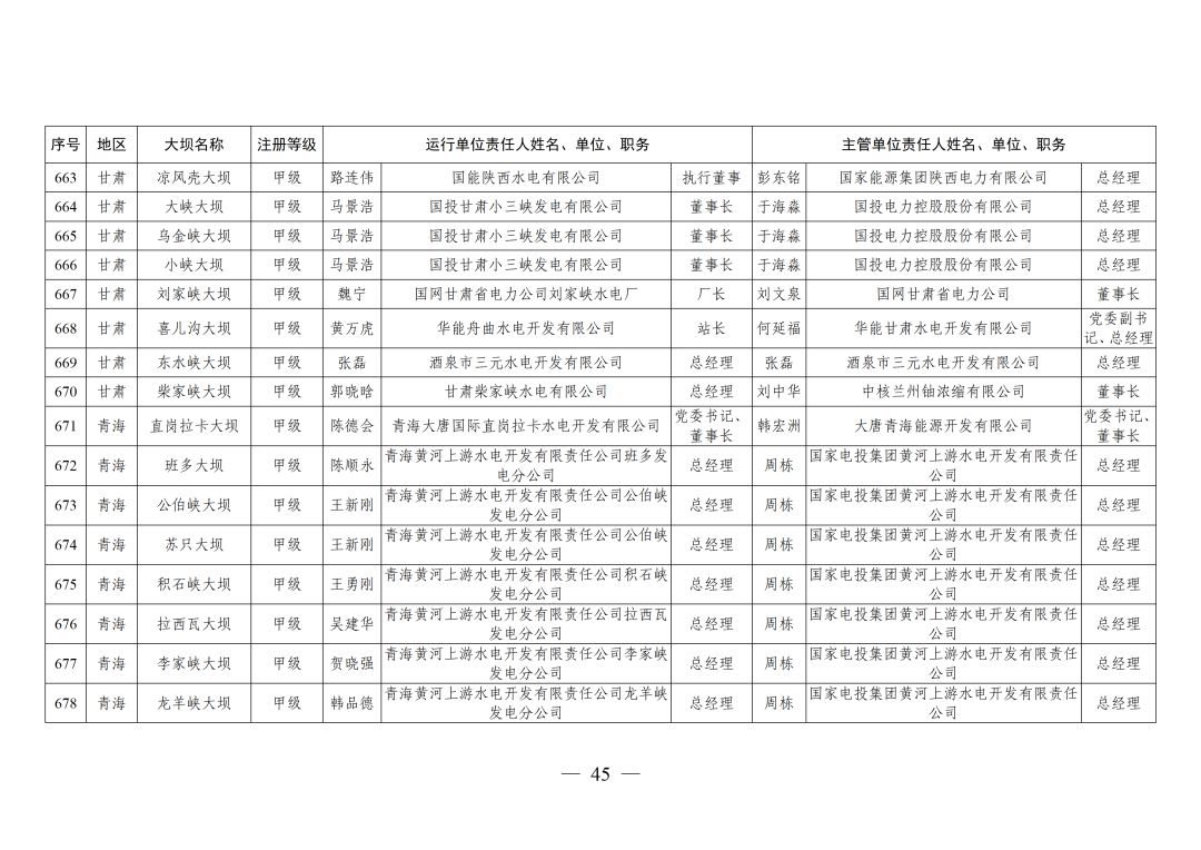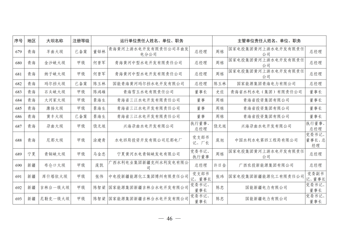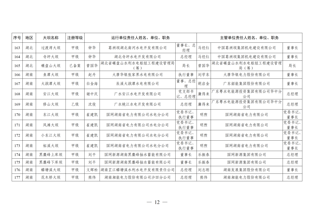 为进一步加强水电站大坝安全监督管理,压紧压实电力企业大坝安全主体责任,按照《水库大坝安全管理条例》(国务院令第77号)、《电力安全生产监督管理办法》(国家发展改革委令2015年第21号)、《水电站大坝运行安全监督管理规定》(国家发展改革委令2015年第23号)等规定要求,现将电力行业718座注册登记和登记备案的水电站大坝(以下简称大坝)运行单位及主管单位的安全责任人名单予以公布。