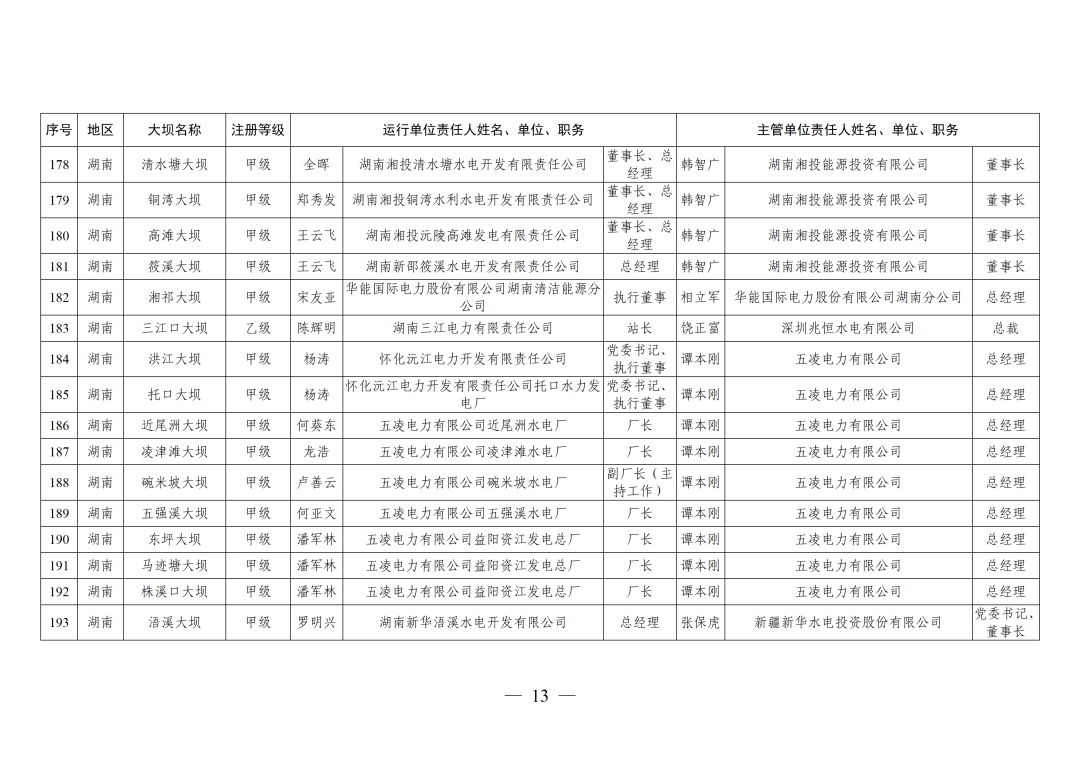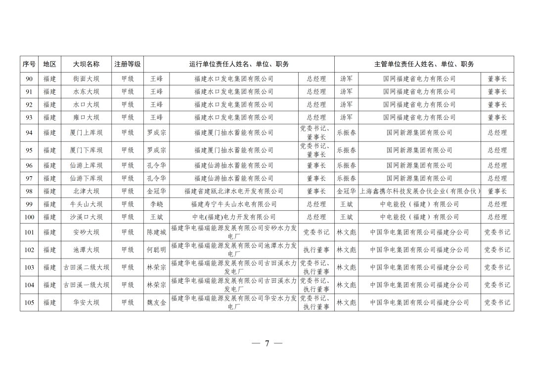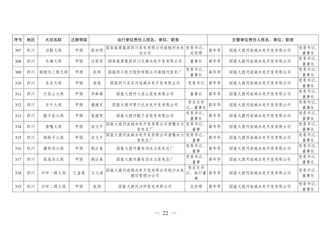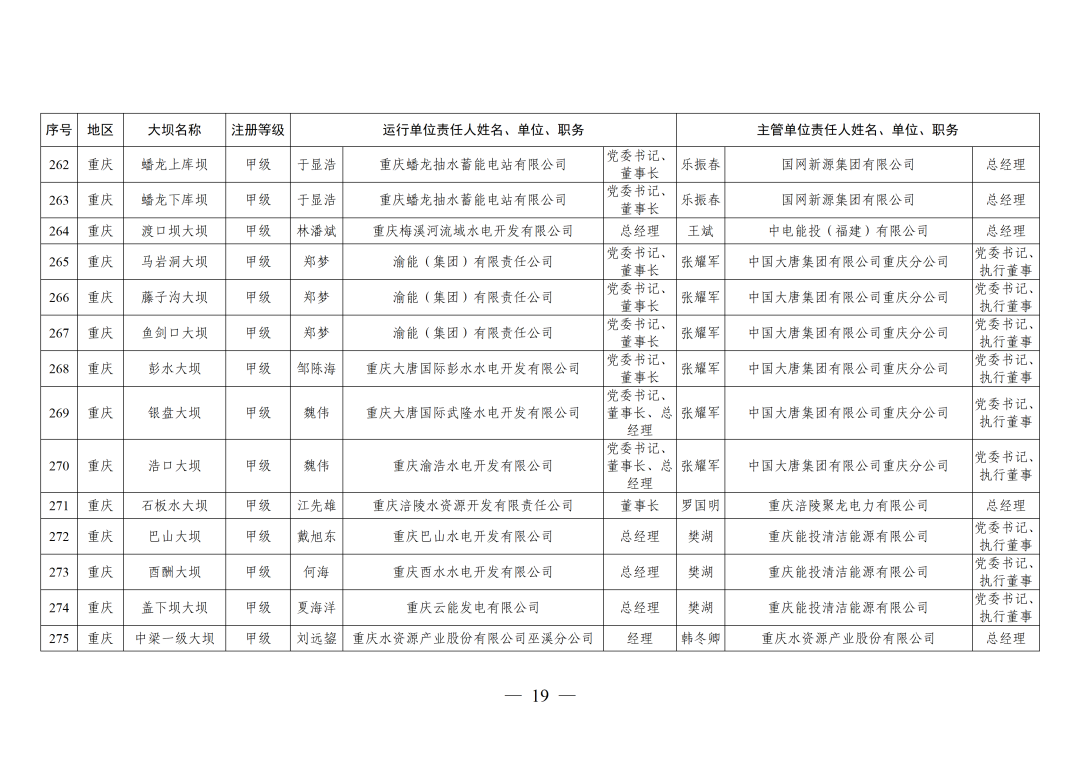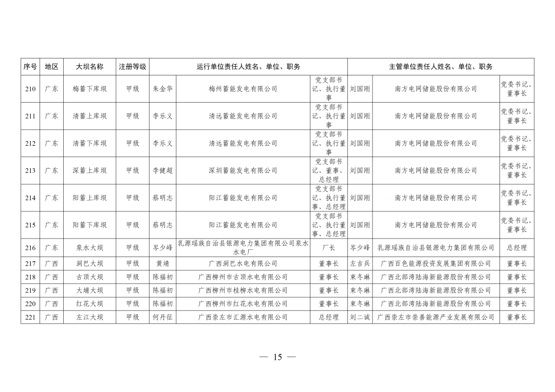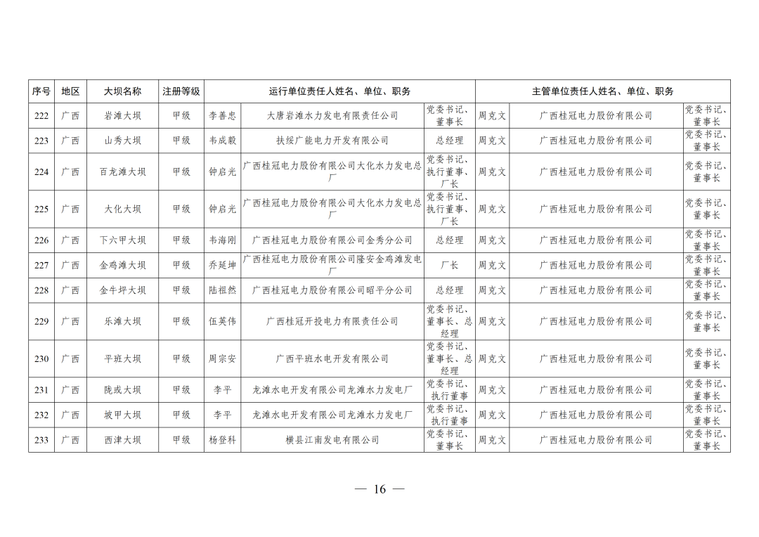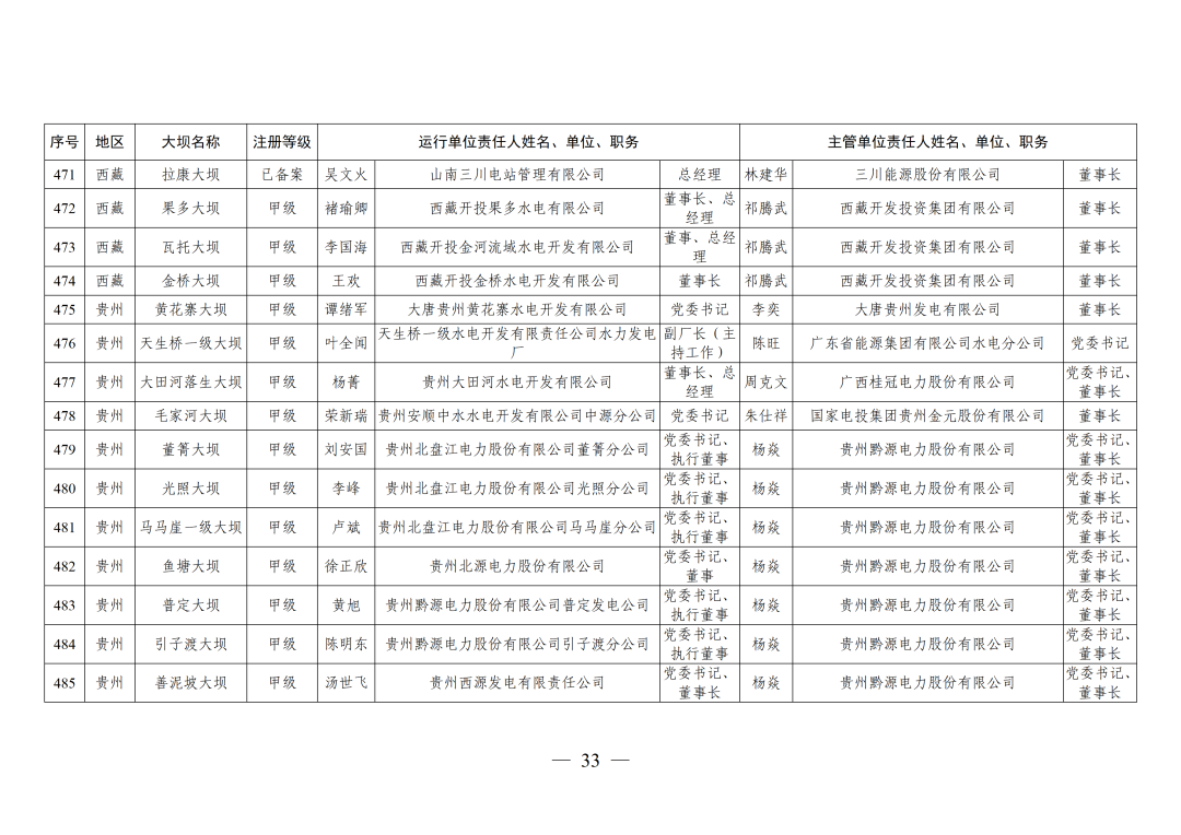 为进一步加强水电站大坝安全监督管理,压紧压实电力企业大坝安全主体责任,按照《水库大坝安全管理条例》(国务院令第77号)、《电力安全生产监督管理办法》(国家发展改革委令2015年第21号)、《水电站大坝运行安全监督管理规定》(国家发展改革委令2015年第23号)等规定要求,现将电力行业718座注册登记和登记备案的水电站大坝(以下简称大坝)运行单位及主管单位的安全责任人名单予以公布。
