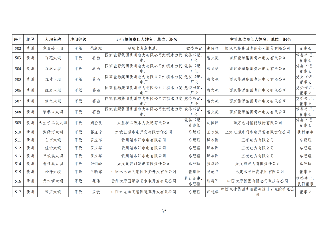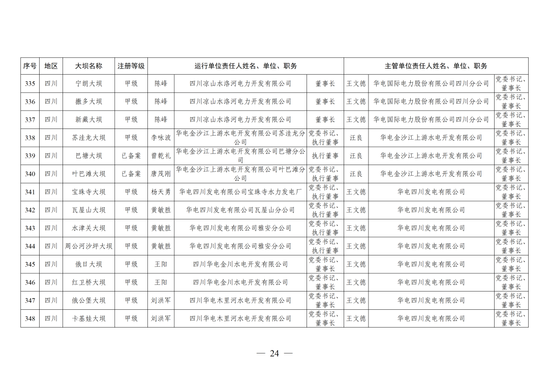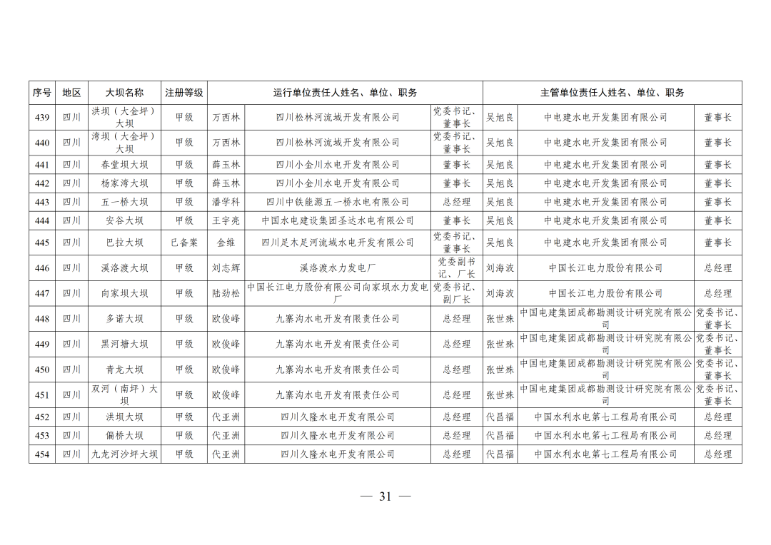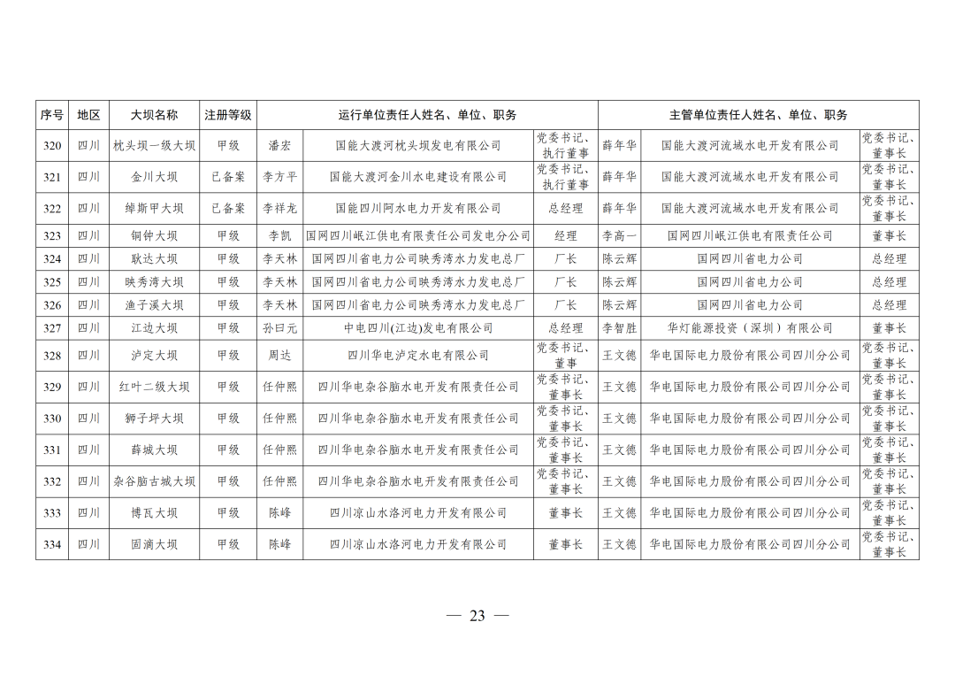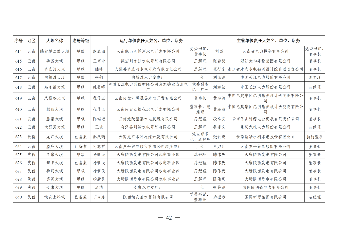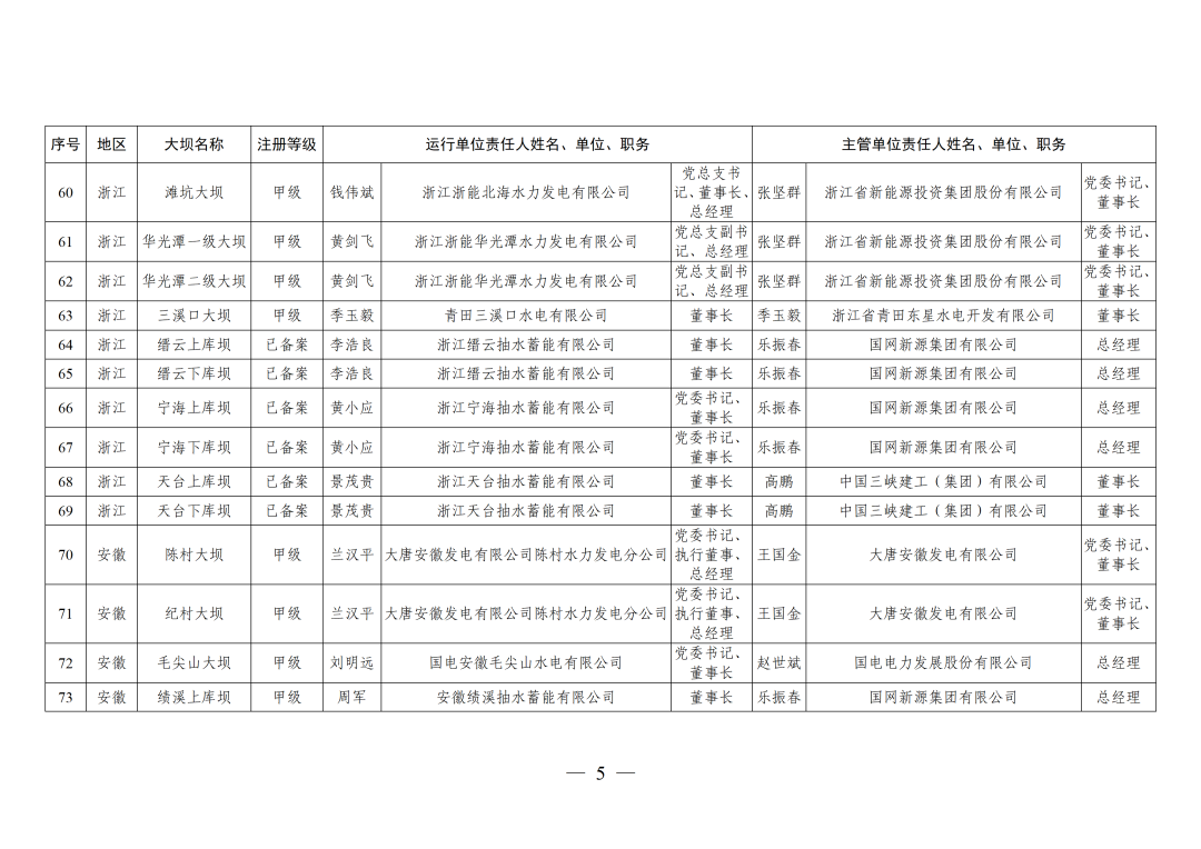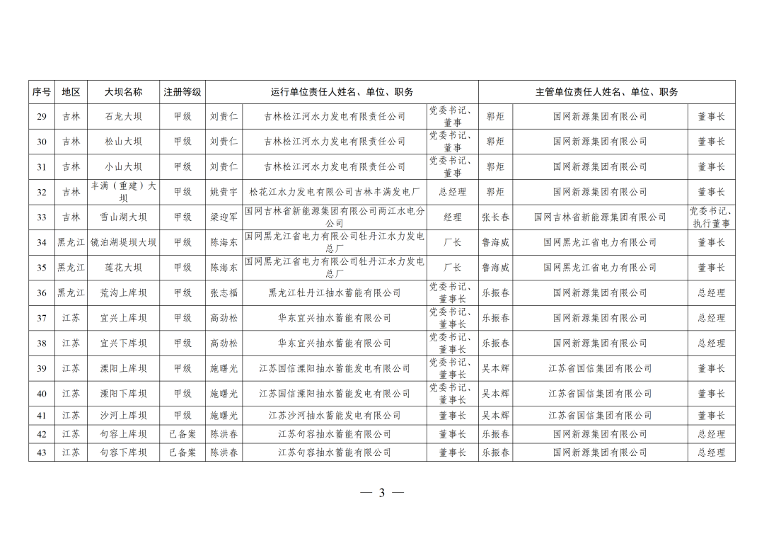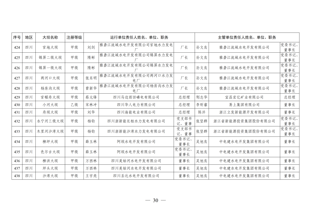 为进一步加强水电站大坝安全监督管理,压紧压实电力企业大坝安全主体责任,按照《水库大坝安全管理条例》(国务院令第77号)、《电力安全生产监督管理办法》(国家发展改革委令2015年第21号)、《水电站大坝运行安全监督管理规定》(国家发展改革委令2015年第23号)等规定要求,现将电力行业718座注册登记和登记备案的水电站大坝(以下简称大坝)运行单位及主管单位的安全责任人名单予以公布。