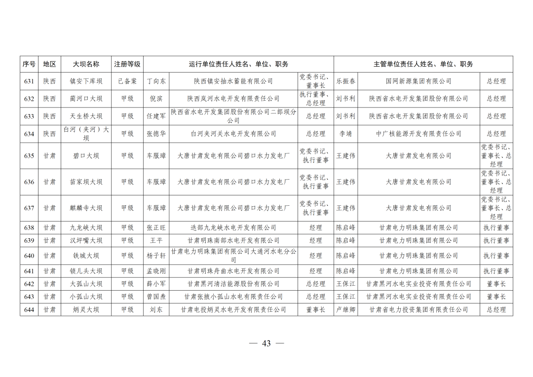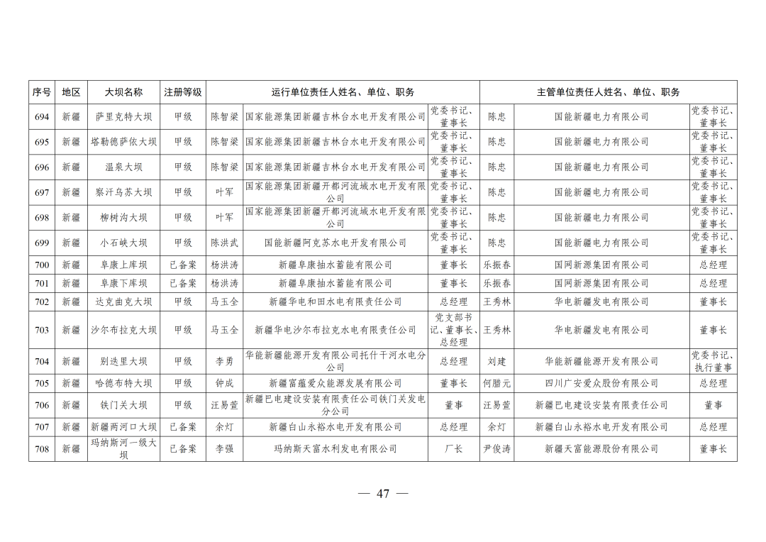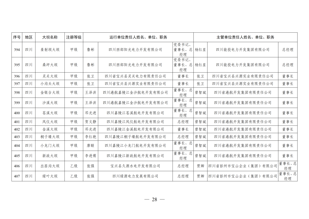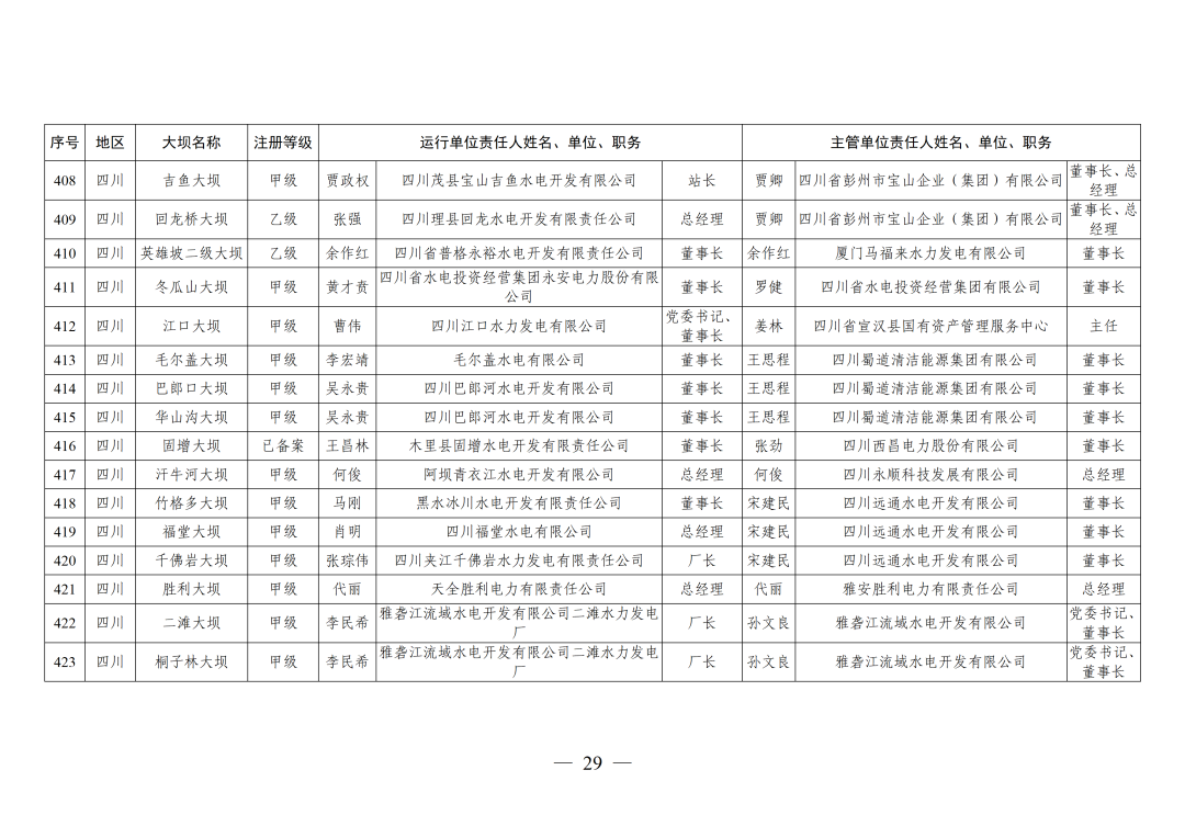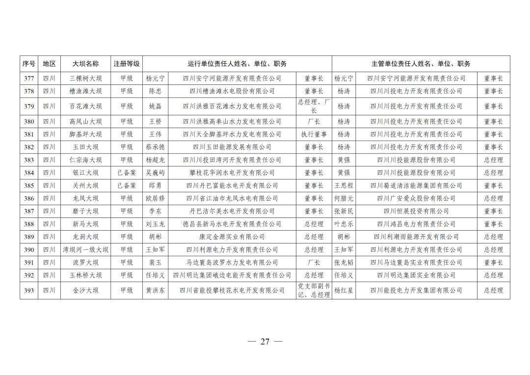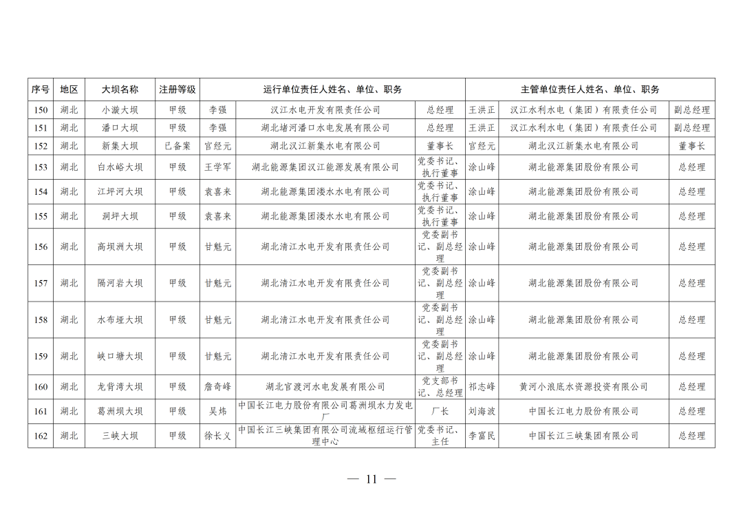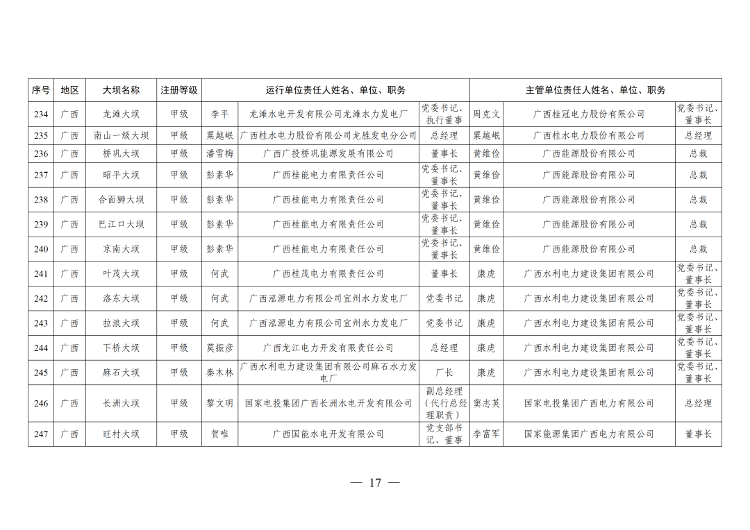 为进一步加强水电站大坝安全监督管理,压紧压实电力企业大坝安全主体责任,按照《水库大坝安全管理条例》(国务院令第77号)、《电力安全生产监督管理办法》(国家发展改革委令2015年第21号)、《水电站大坝运行安全监督管理规定》(国家发展改革委令2015年第23号)等规定要求,现将电力行业718座注册登记和登记备案的水电站大坝(以下简称大坝)运行单位及主管单位的安全责任人名单予以公布。