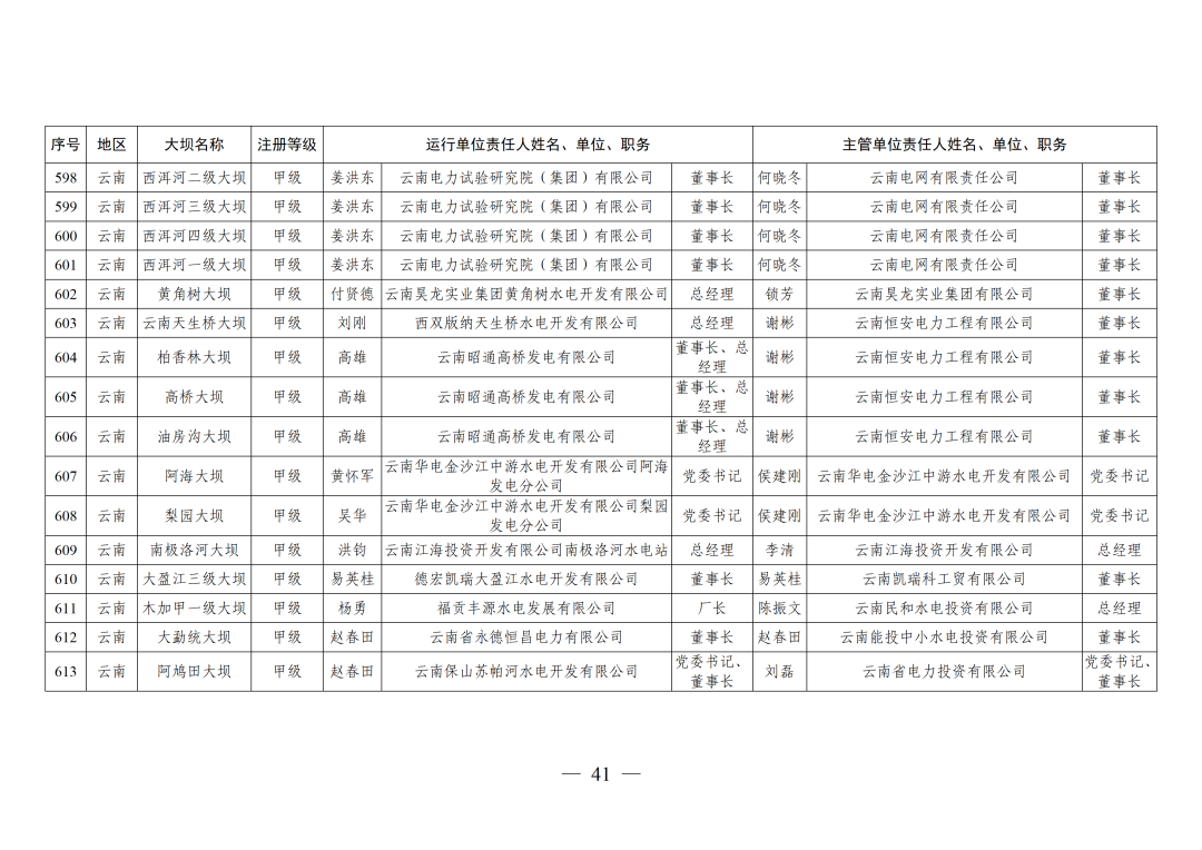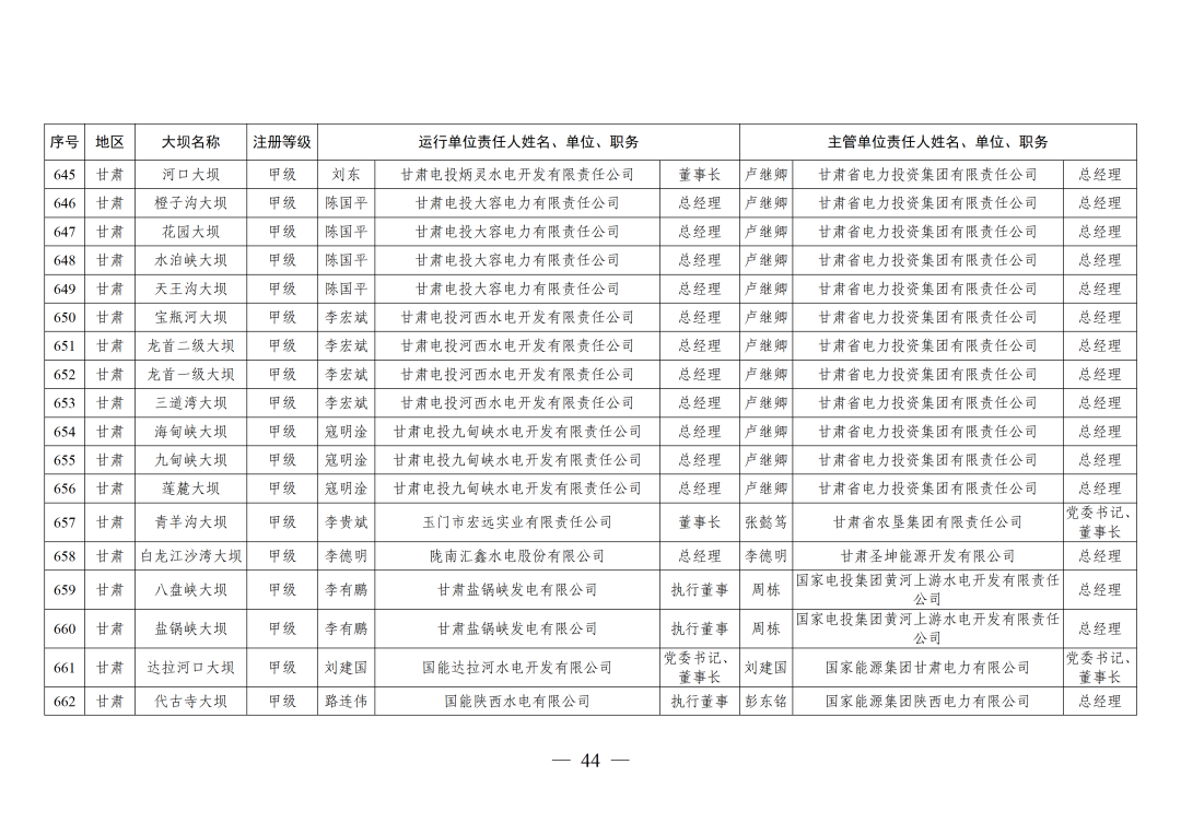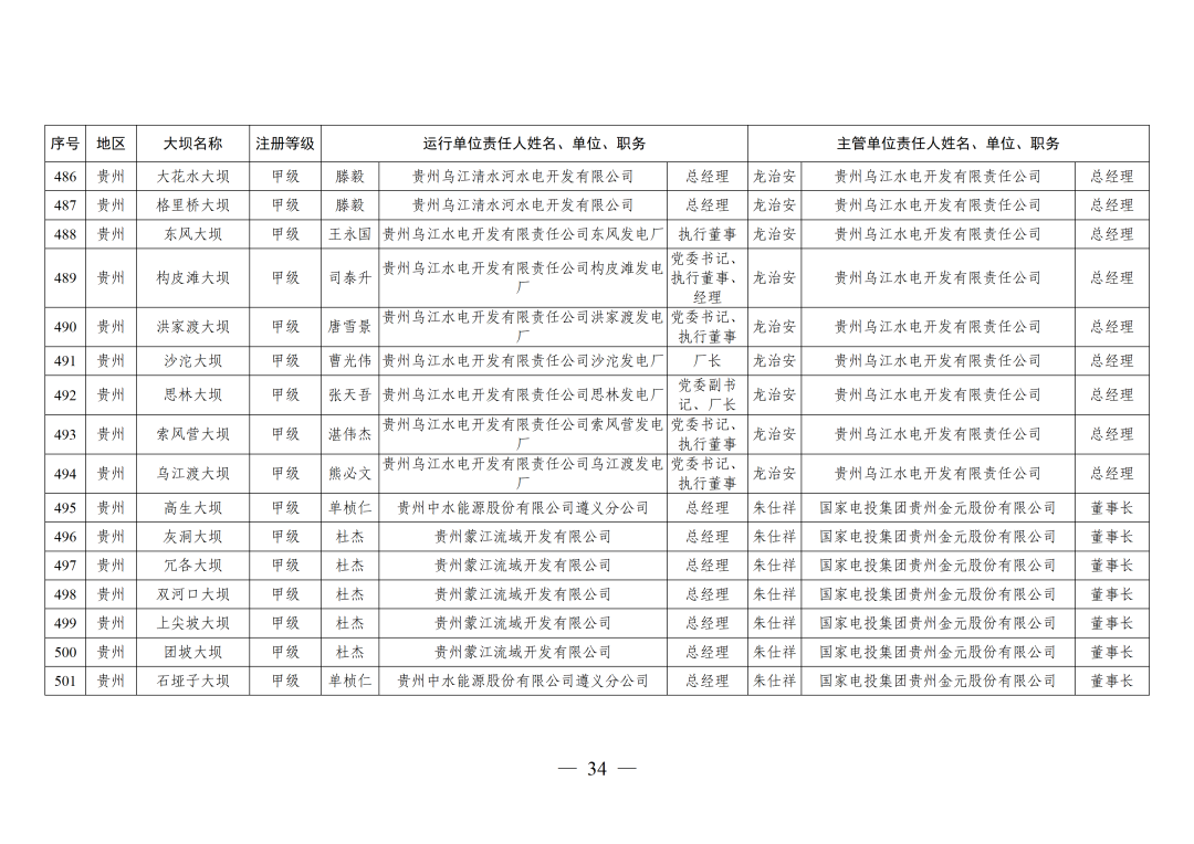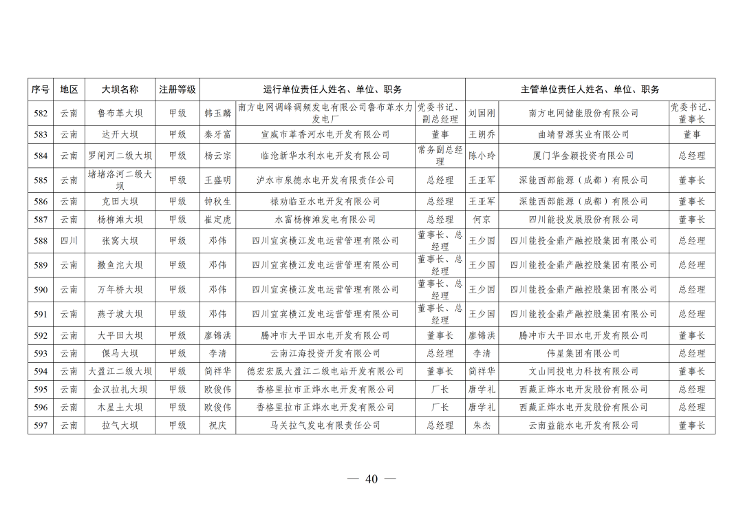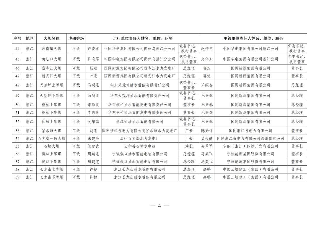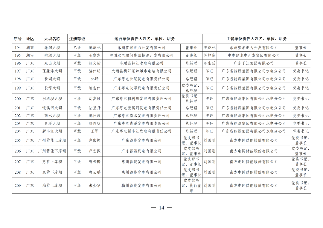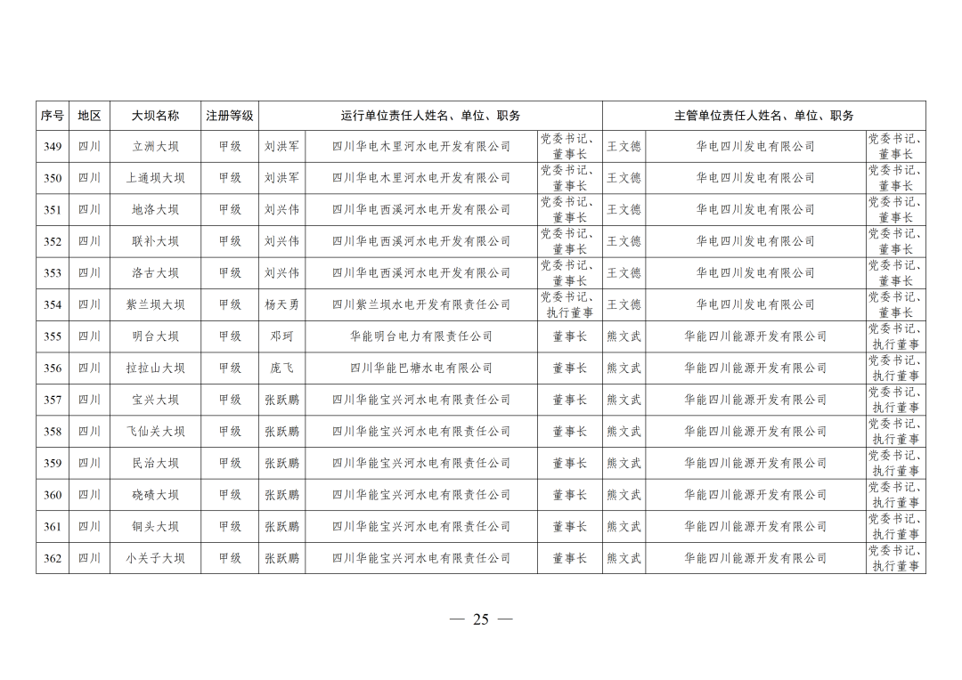 为进一步加强水电站大坝安全监督管理,压紧压实电力企业大坝安全主体责任,按照《水库大坝安全管理条例》(国务院令第77号)、《电力安全生产监督管理办法》(国家发展改革委令2015年第21号)、《水电站大坝运行安全监督管理规定》(国家发展改革委令2015年第23号)等规定要求,现将电力行业718座注册登记和登记备案的水电站大坝(以下简称大坝)运行单位及主管单位的安全责任人名单予以公布。