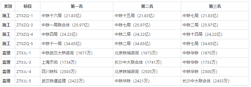 ZTXZQ-1标段候选排名如下: 第一名,中铁十六局集团有限公司,报价2182821556元; 第二名,中铁十五局集团有限公司,报价2182848417元; 第三名,中铁七局集团有限公司,报价2182854809元。 ZTXZQ-3标段候选排名如下: 第一名,中铁一局集团有限公司与武汉铁路建筑安装工程有限责任公司联合体,报价2597053468元; 第二名,中铁七局集团有限公司,报价2597109815元; 第三名,中铁二局集团有限公司,报价2597211652元。 ZTXZQ-4标段候选排名如下: 第一名,中铁四局集团有限公司,报价2422187173元; 第二名,中铁二局集团有限公司,报价2422315685元; 第三名,中铁十四局集团有限公司,报价2422186035元。 ZTXZQ-5标段候选排名如下: 第一名,中铁十一局集团有限公司,报价3464549535元; 第二名,中铁二局集团有限公司,报价3464700459元; 第三名,中铁七局集团有限公司,报价3464548308元。 监理ZTXJL-1标段候选排名如下: 第一名,中铁武汉大桥工程咨询监理有限公司,报价16712152元; 第二名,北京铁城工程咨询有限公司,报价16728931元; 第三名,中铁华铁工程设计集团有限公司,报价16695300元。 监理ZTXJL-3标段候选排名如下: 第一名,上海天佑工程咨询有限公司,报价17340000元; 第二名,长沙中大监理科技股份有限公司与中铁城投工程技术有限公司联合体,报价17410000元; 第三名,中铁华铁工程设计集团有限公司,报价17325400元。 监理ZTXJL-4标段候选排名如下: 第一名,四川铁科建设监理有限公司,报价25029157元; 第二名,北京铁城工程咨询有限公司,报价25054287元; 第三名,中铁华铁工程设计集团有限公司,报价25004000元。 监理ZTXJL-5标段候选排名如下: 第一名,武汉铁道工程建设监理有限责任公司,报价24219606元; 第二名,中铁华铁工程设计集团有限公司,报价24212300元; 第三名,长沙中大监理科技股份有限公司与中铁城投工程技术有限公司联合体,报价24330000元。 武汉枢纽直通线工程北起云梦东站,向南串联武汉市与孝感市,是国家高速铁路网中武汉枢纽内实现西向高铁与中心城区高效衔接的关键工程。线路自云梦东站引出后,经革新线路所接入武汉至宜昌高铁联络线,再通过走马岭线路所引入汉阳站,最终跨过长江接入南湖东站,全线新建正线79.021公里,加上利用武宜高铁联络线段落,总里程达90.419公里。同时,该工程还包含三四线铁路新建段落,进一步强化武汉枢纽内多方向、多层次的铁路运输组织能力。 从技术标准来看,武汉枢纽直通线按高速铁路标准设计,云梦东站至革新线路所段设计速度350公里/小时,走马岭线路所至黄家湖线路所段按250公里/小时设计,正线双线布置,最小曲线半径一般地段7000米、困难地段5500米,到发线有效长度650米,最小行车间隔仅3分钟。三四线铁路工程则按城际铁路标准建设,设计速度200公里/小时,双线布置。 四个施工标段施工内容各有侧重:ZTXZQ-1标段以武九联络线跨文化大道特大桥、跨京广铁路特大桥及黄家湖线路所特大桥等桥梁工程为主;ZTXZQ-3标段重点工程为白沙洲长江桥跨汪家嘴立交段特大桥、汉阳站南咽喉区特大桥及汉阳动车所场坪路基;ZTXZQ-4标段承担全线铺轨工程(不含白沙洲公铁合建段),同时包含蔡家台汉江特大桥这一全线重点控制性工程;ZTXZQ-5标段以府河特大桥、孝感南高架站特大桥、澴水河特大桥三座特大桥为主要建设内容,是本次站前施工中线路最长、工程量最大的标段。 各标段三候选报价差均十分接近,整体竞争比较激烈。ZTXZQ-1标三候选总价差约33万元,ZTXZQ-3标价差约158万元,ZTXZQ-4标价差约130万元,ZTXZQ-5标三候选中第三名报价甚至略低于第一名,价差仅约15万元。 武汉枢纽直通线建成后,将大幅缩短云梦、孝感等地与武汉主城区之间的时空距离,武汉西部地区的居民乘坐高铁出行不必再绕行武汉站或汉口站,枢纽内换乘效率将明显提升。同时,三四线铁路的新建也将增强武汉铁路枢纽多方向集散能力,为途经武汉的过境客流提供更顺畅的通过条件。
