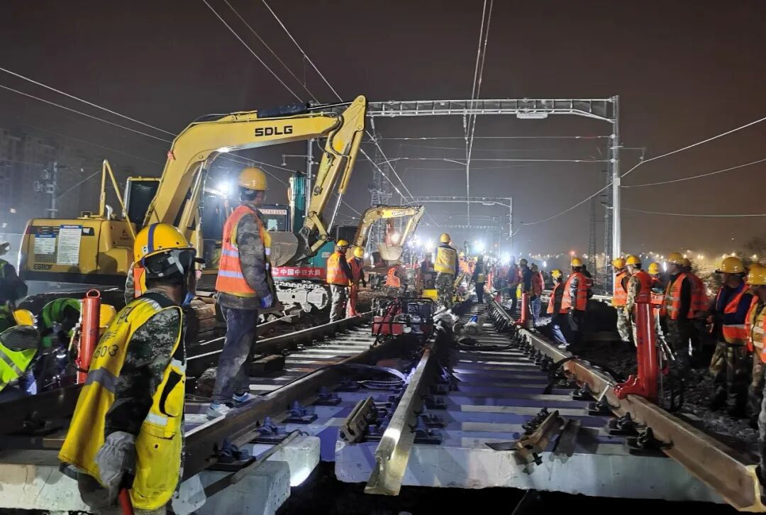 施工现场 本次施工为Ⅱ级封锁天窗作业,连续两晚夜间施工,利用2个290分钟夜间天窗,精准完成6组12号单开道岔插入、道岔横纵移、线路清砟回填、线路捣固、防护网安拆及电务系统调试等全流程作业。 施工区段位于西长线北京西站至后吕村站区间,车站采用2台4线布置,地处既有运营枢纽核心,地下电缆密集、专业交叉多、安全风险高、作业精度要求严苛,是工程全线重点控制性工序。面对夜间作业、工序紧凑、既有线管控严格等多重考验,项目部超前谋划、精细部署,多次优化施工方案,全流程推演演练;提前完成道岔预铺、机具调试、道砟储备、照明布设、轨旁设备防护等准备工作,全员岗前培训与安全技术交底全覆盖。