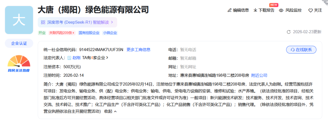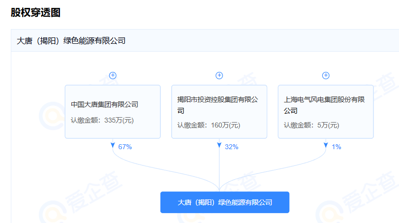 近日,大唐(揭阳)绿色能源有限公司成立,法定代表人为赵刚,经营范围包含:发电业务、输电业务、供(配)电业务;供电业务;新兴能源技术研发等。企查查股权穿透显示,该公司由中国大唐集团有限公司、电气风电等共同持股。